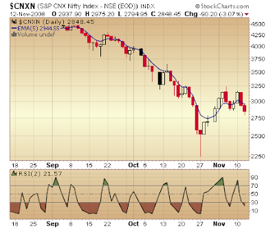 Now Every Body Might be in a great confusion with yesterdays closing in dow. Dow shows a massive Strength of +552 pts also recovered nearly more than 800 pts from its day lows. You may say that oh what a blow to the bears!!!. But the real fact is that they need still nearly +200 pts i.e a closing above 9060 by today in dow to get an exact buy signal as per 5 EMA trading system in weekly charts. which will likely to be the strongest signal in dow to take them upwards So Will our market respond to dow's yesterday's movement? This is everyones routine question about dow. Will our respond to global news? Will we close today positive today as inflation figures are now at single digits (9.8% ). Whatever may be the reason's, global cues, dow movement, Asian market cues our market have its own direction. It may responds to the intial stimulus from the global markets or from the so called economic data's But the Closing will be entirely depends on the Biggie Operators. The could operate the market as they wish. And nifty bends accordingly. To find a technical direction in nifty here is a 3 month weekly chart for nifty. And applying the same 5 EMA concept to find the direction of the market. As per 5 EMA trading system still there is no great buy on this chart.. It reveals only the sell signal. i.e the if price still trades below the 5EMA(<2996). So to get a buy signal on nifty we need atleast a overall positive closing figure above 2973 to hope for higher targets and a close above 3000-3020 levels in nifty by today(14th Friday) will induce a buy signal on Weekly charts. But if we apply the same concept to the daily charts we get a sell signal for today. i.e last wednesday's closing is exactly below the 5EMA(2945). So inorder to get a buy signal we need a close atleast above 2950 roughly to get a buy signal in nifty charts. Summary 1)Nifty atleast requires a close above 2950 to sustain a upward momentum by today itself 2)Nifty above 2950 will induce buy signal in daily charts 3)Nifty above 3000-3020 will induce buy signal in weekly charts and targets nifty towards 3450 4)Any close below 2950 will trigger a sell signal in both daily & weekly charts may be a possible testing of newer lows in nifty in coming weeks 5)5EMA Systems, Falling 2- Period RSI EMA systems suggest a selling wave in coming days. As of now SGX Nifty futures are trading near 2890 levels. Asian markets opened positively. The only worrying factor is that Rupee started weakening against dollar and dow futures trading once again in negative direction(-84 pts). Hmmm,seems FII's once again started deleveraging once again from our markets. Todays closing is going to be the exact fight between the bulls and bears. Nowdays friday's only belongs to Warrior Traders rest stay away and just watch the market. Regards, Rajandran R Happy Trading!!